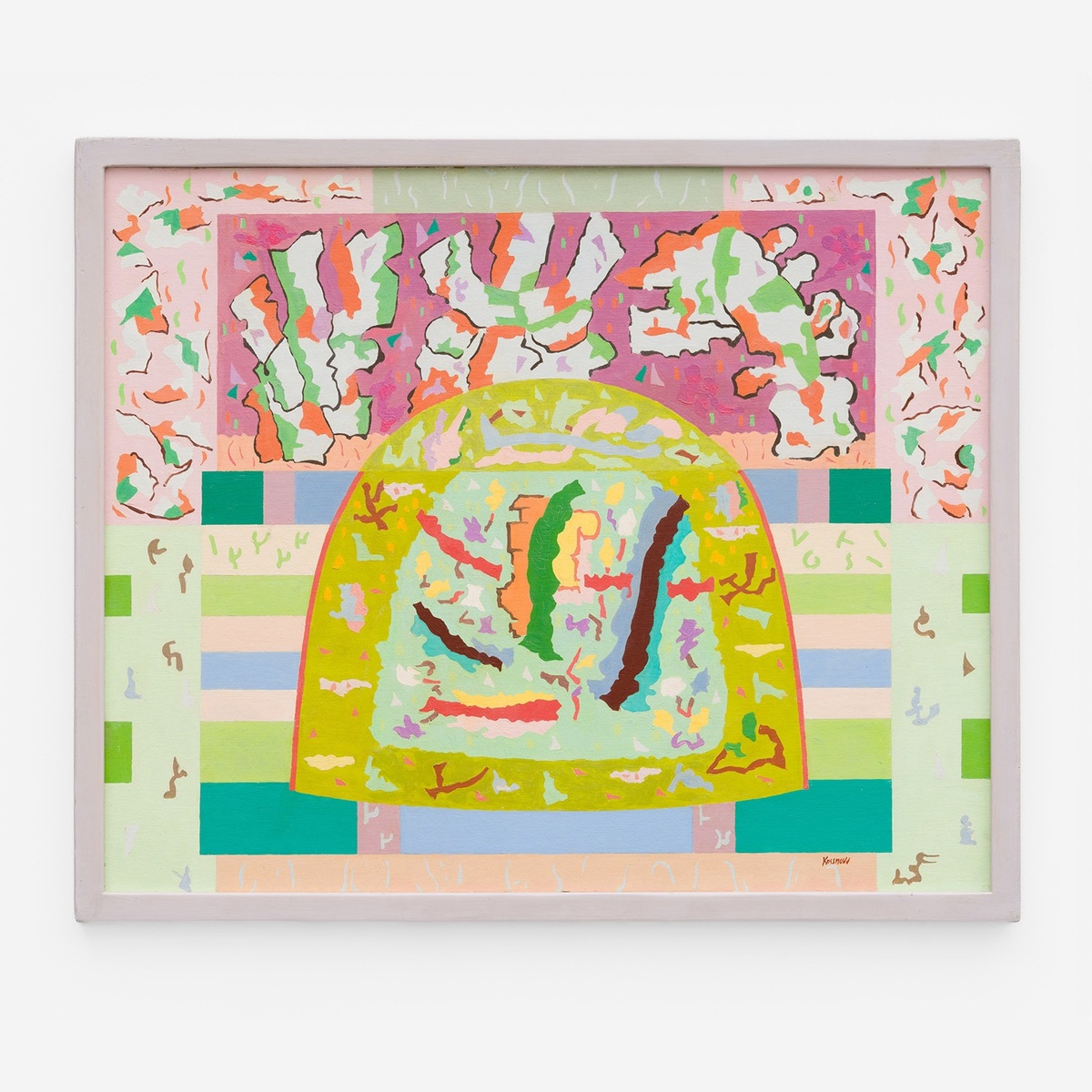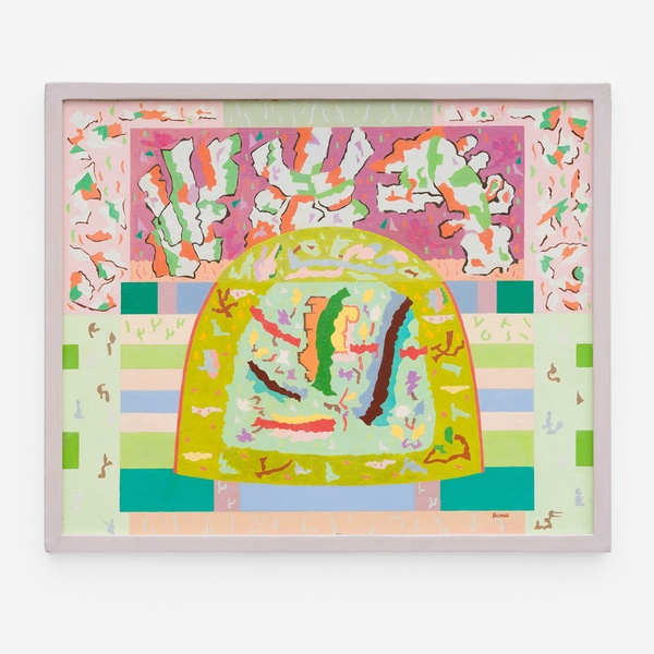 Art historian Aimée Brown Price describes, “forms were no longer truly symmetrical or at rest, locked into place, but played off against one another. New, amoebic, or jagged forms appear, sometimes in registers or within rectilinear zones, sometimes loosely looped together with laces of bright color. What might in more ordinary paintings be understood as background and foreground can be differentiated but as in a theatrical stage.”