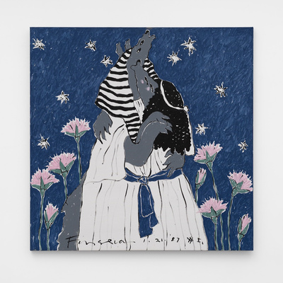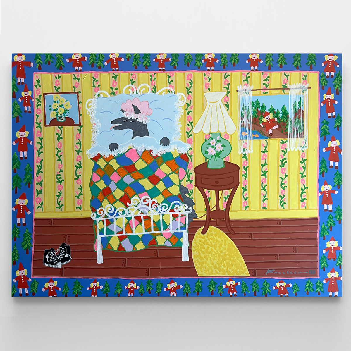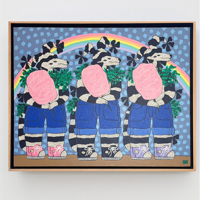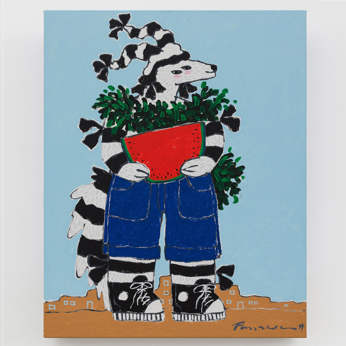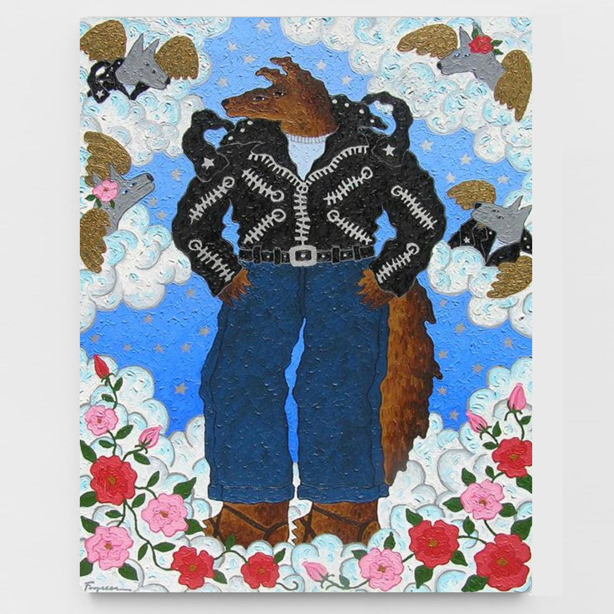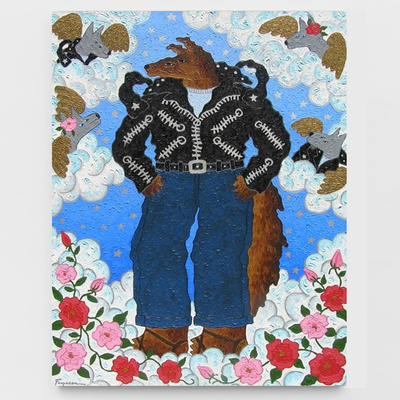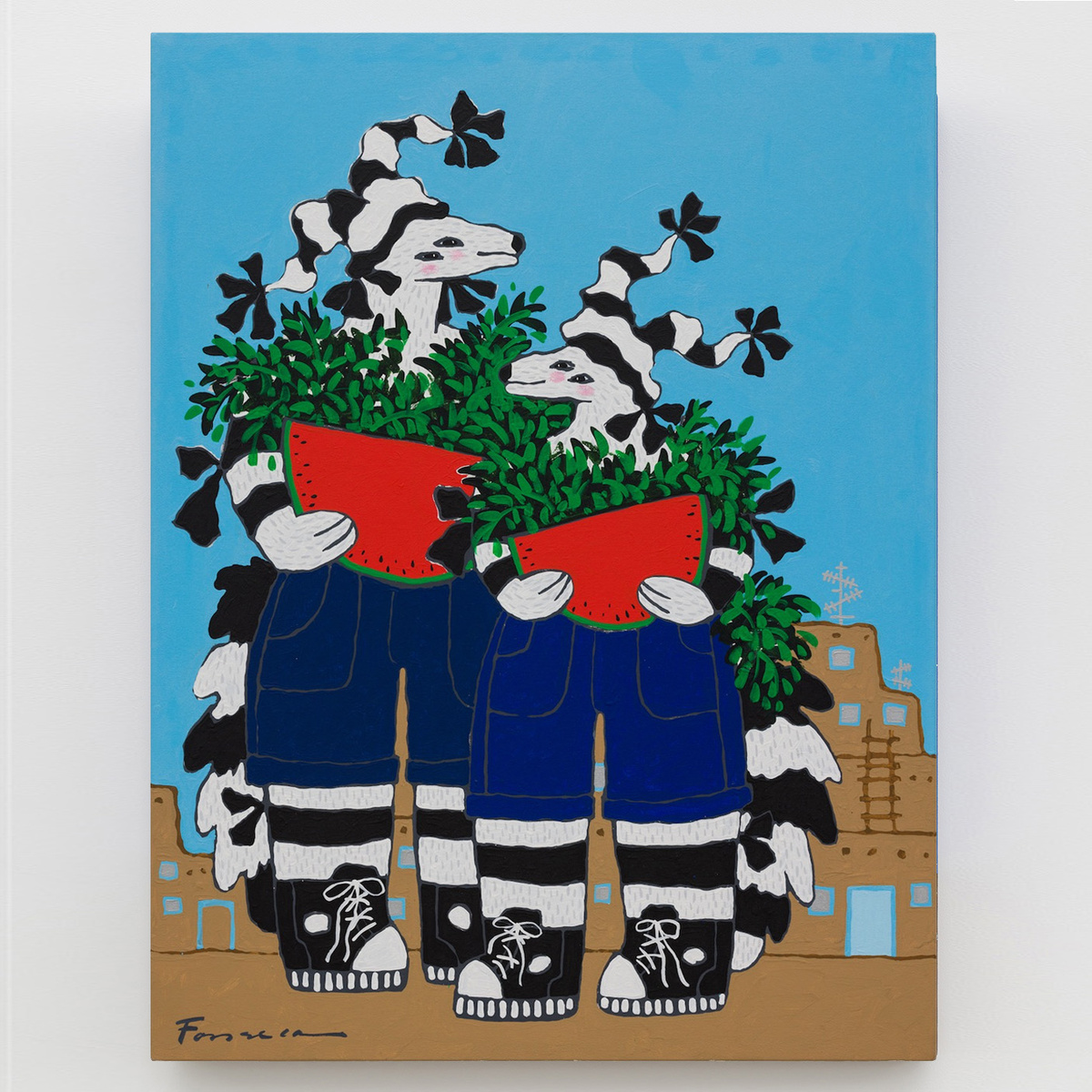 Harry Fonseca, Coyote Koshares with Cotton Candy, 1983 circa. Acrylic and glitter on canvas. 24 x 30 inches.