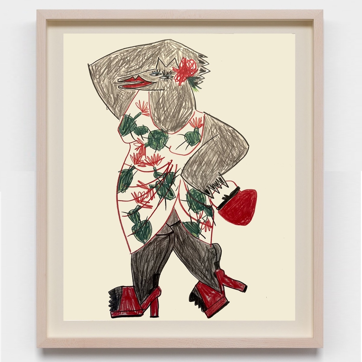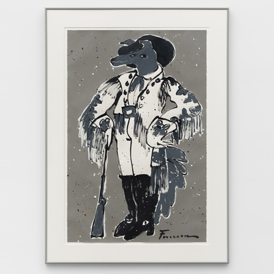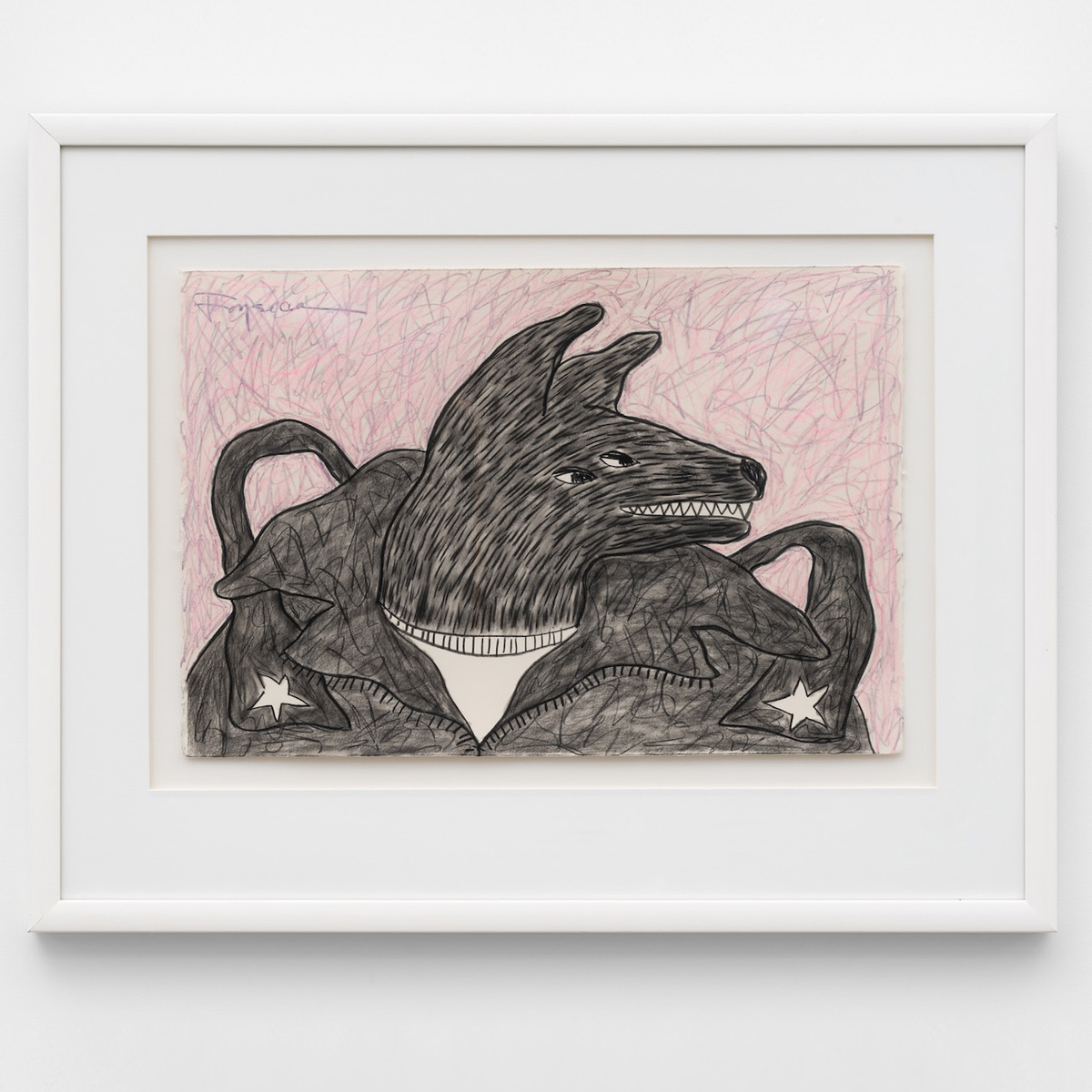 In the mid-1970s, Fonseca began portraying Coyote, a central figure in the traditional Native American dances in Northern California. From 1847, these dances were made illegal under Federal legislation– it was only until 1978 that Native Americans would receive protections under the American Indian Religious Freedom Act. Later, Fonseca began rendering Coyote in more contemporary settings—as an artist in New York City, or dressed in leather jacket and sneakers in the Mission District in San Francisco.