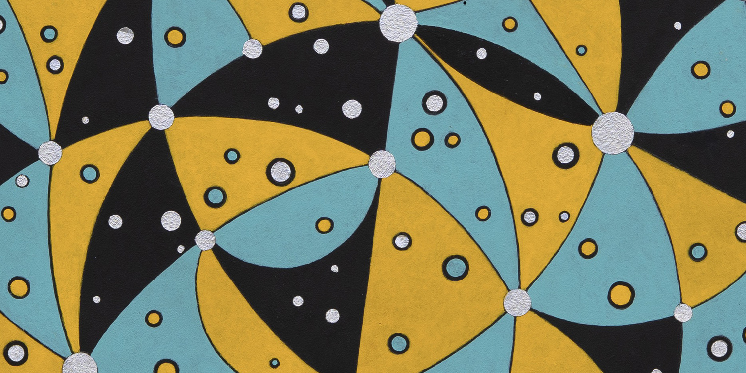 The paintings may be positioned in any way—there is no right side up—and the shelf on which they rest is a part of the work. Each composition contains a group of interwoven geometric figures: the equilateral triangle (from the tetrahedron), the circle (from the sphere); the square (from the cube); and the cone—shapes that have been a part of Willenbecher’s work for over 60 years.