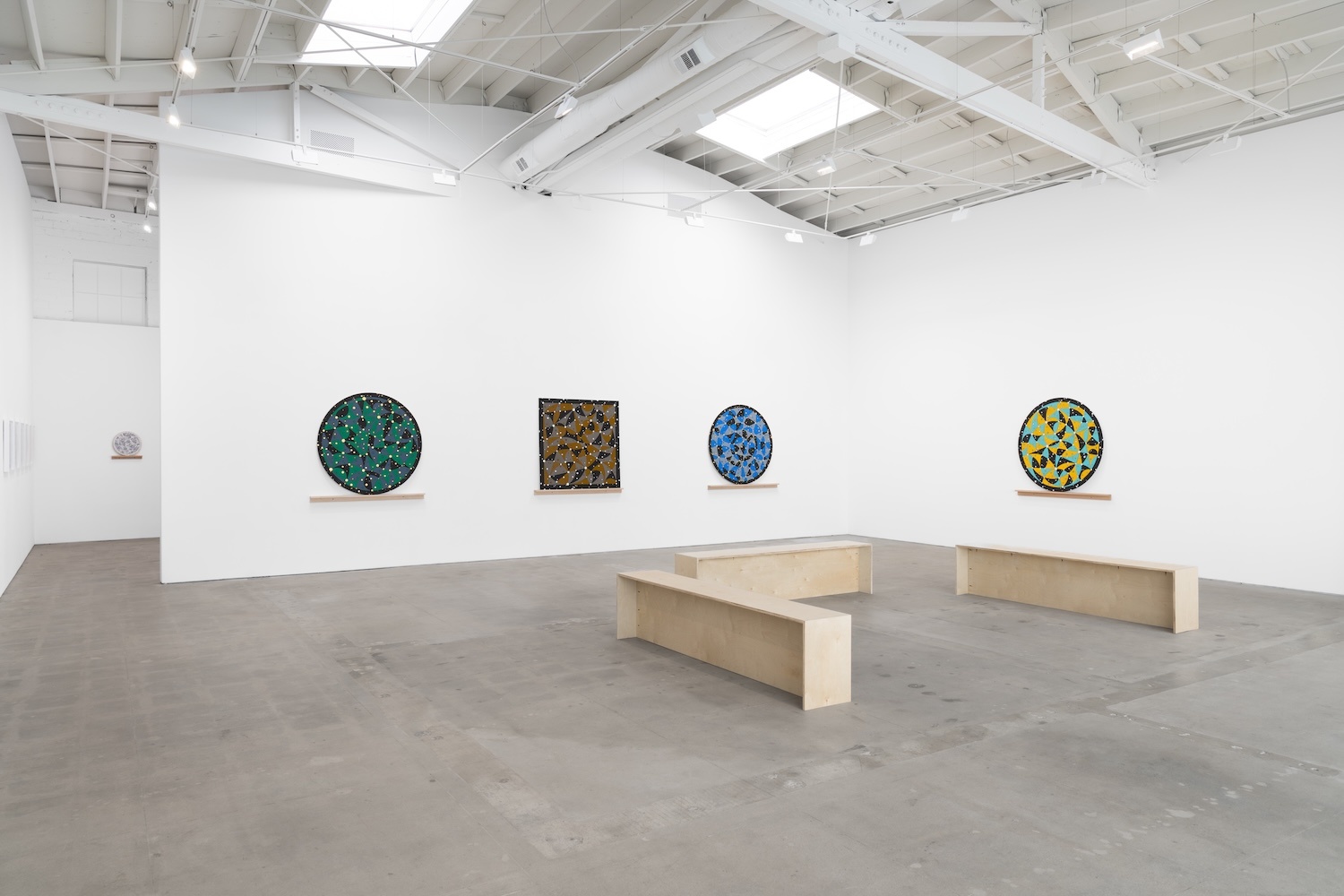 The exhibition includes a series of new works each of which is entitled Object. Willenbecher’s works are made of acrylic paint and circles of metallic leaf on fiberboard. In 1963 Donald Judd wrote that the forms in Willenbecher’s works “combine into a quiet but definite circling movement. You see arcs of the various circles. The cause is so mechanical and understated that it is hard to figure out at first…the work is generally rather philosophical…the sorts of meaning Willenbecher is dealing with are interesting. In so far as art is philosophical this is relevant, believable philosophy, which, since it is in the art, takes art.”