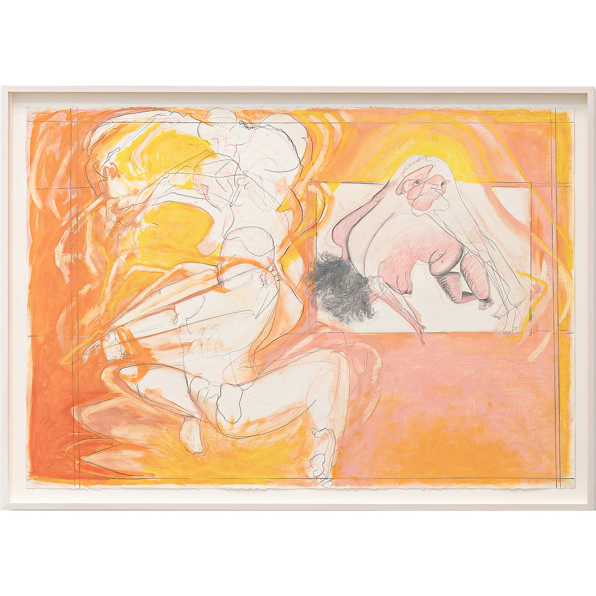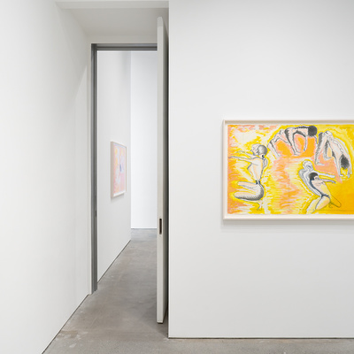 Also included in the exhibition are Conte’s works on paper, where the physical qualities of the graphite and oil-stick draw attention to her active drawing process. In these works, the paper’s bare surface can be seen even when the figures‚either fully rendered or defined by a single line—grapple with the vibrant, muscular marks of oil stick.