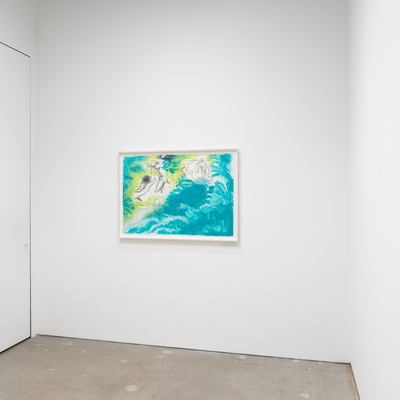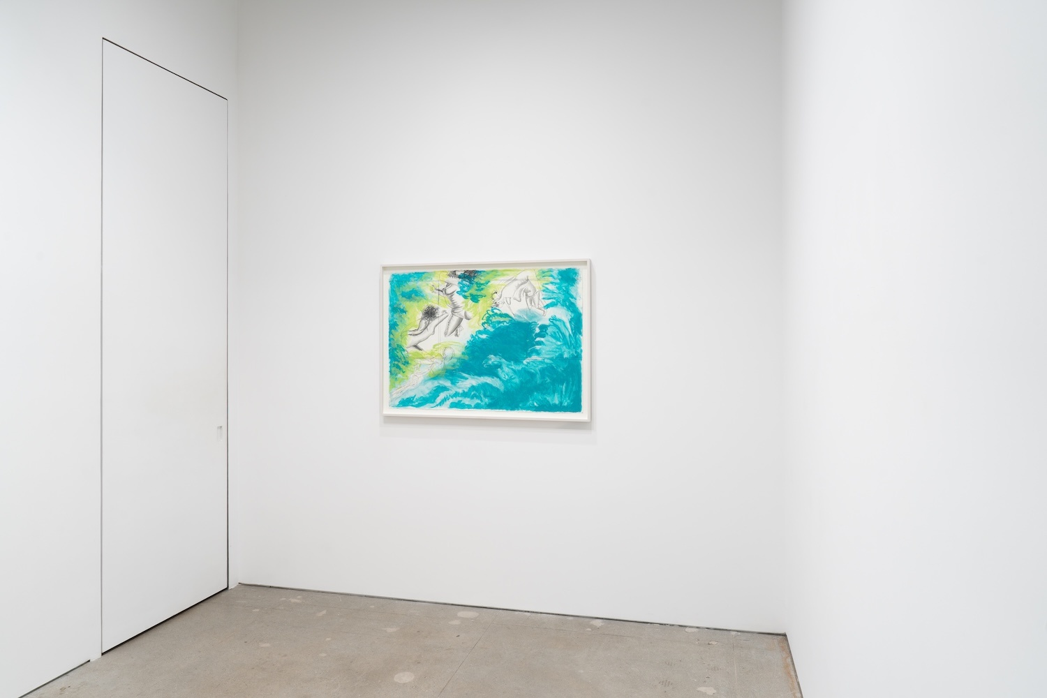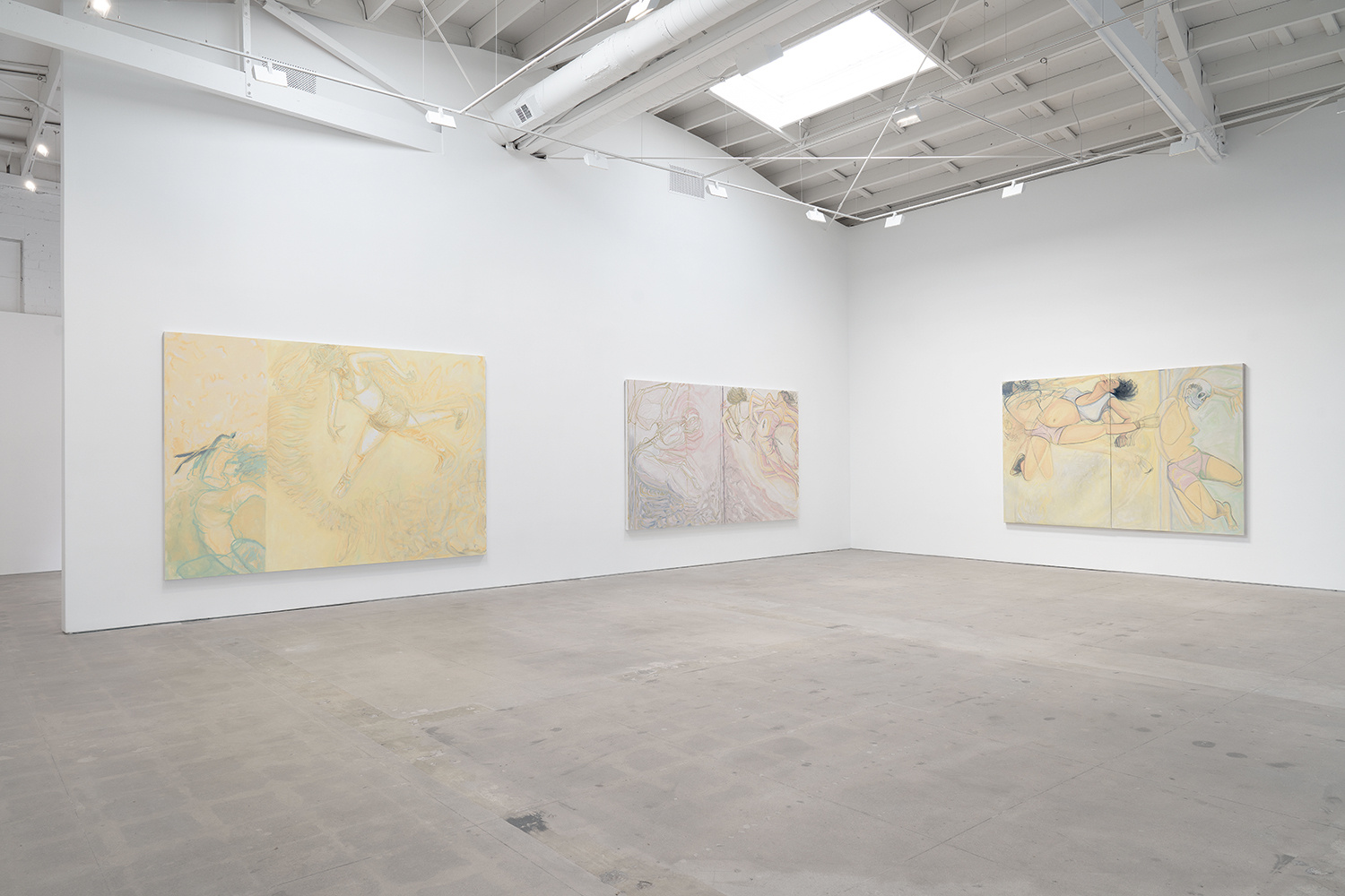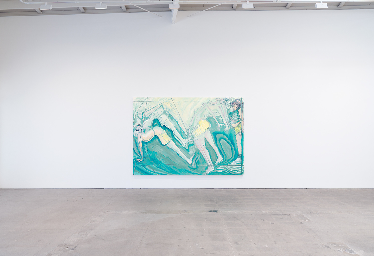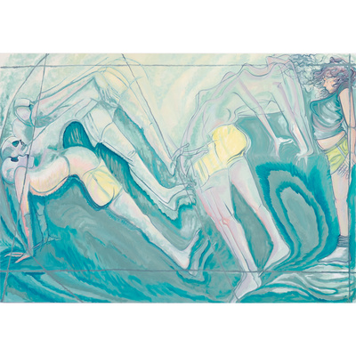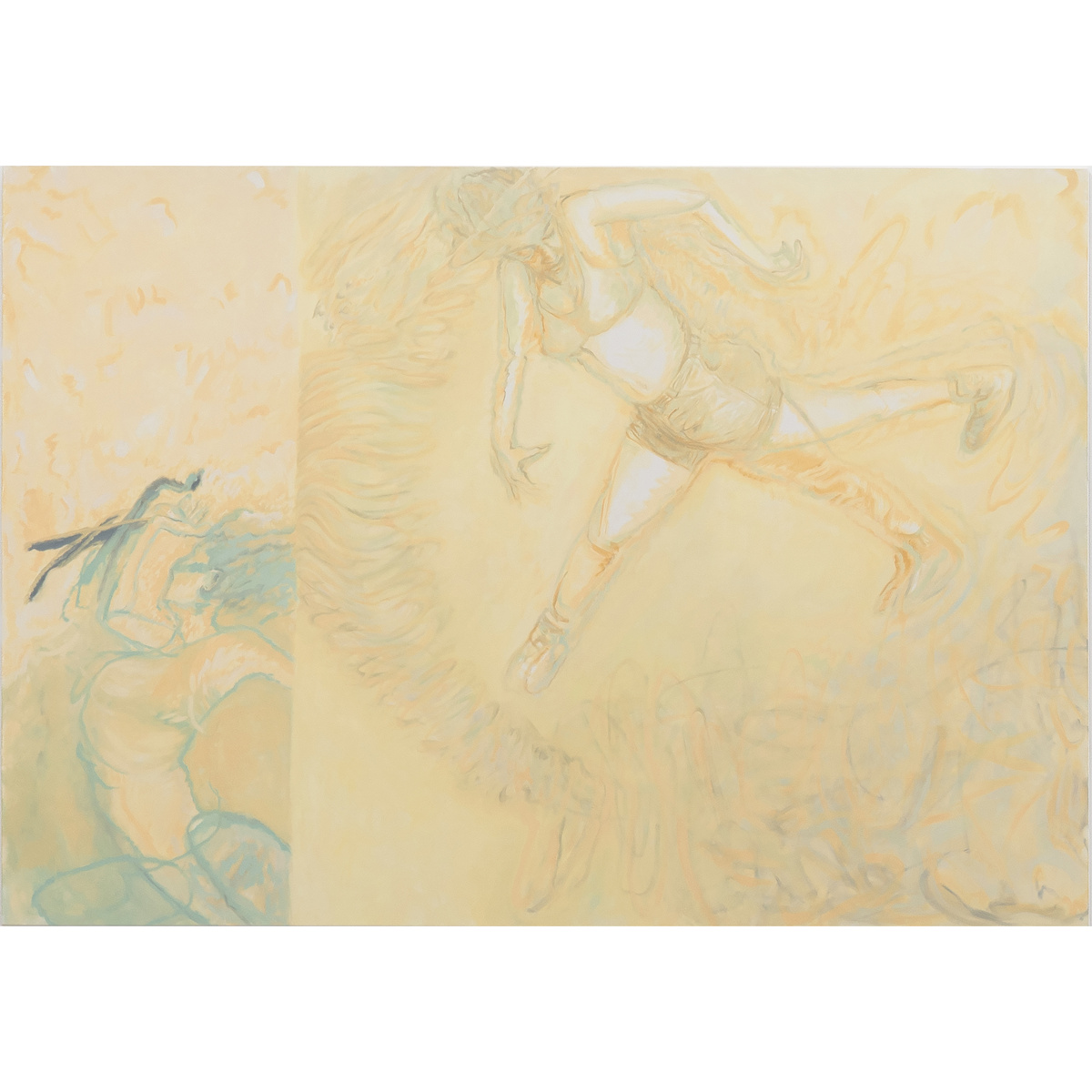 Conte’s densely layered painting surfaces behave like seismographic recordings, registering the kinetic energy of kicking, falling, and floating figures. The space around the figures reacts with bold calligraphic strokes and luminous ripples of color that reverberate to the edges of the canvas. At times, the boundaries of the body are completely dissolved, subsumed in the color-field of the surface. Other times, Conte strips the figure down to its skeletal core. This push-pull between gestural line and painterly form is as much a conversation about painting as it is the figures’ narrative trajectory.