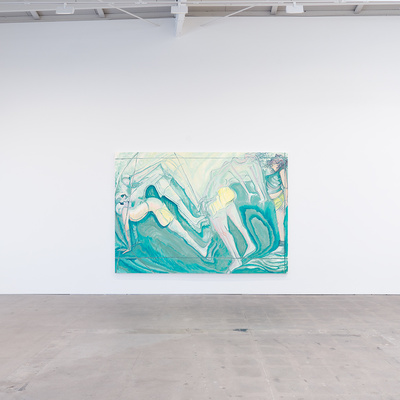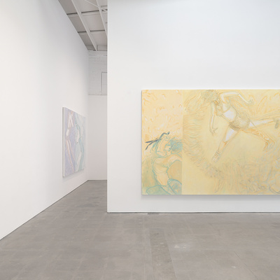 In this new body of work, Conte eschews geographic and scenic markers, allowing the canvas-space to remain fully open and immersive, governed by its own gravitational laws and spatial logic. Contained within this space are life-sized female figures in modern clothing that surge through and move beyond the physical and painted frames of the canvas, creating moments of tension and release.